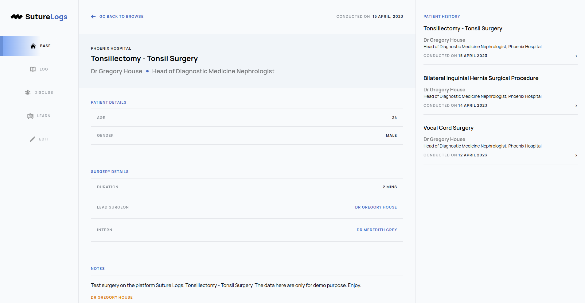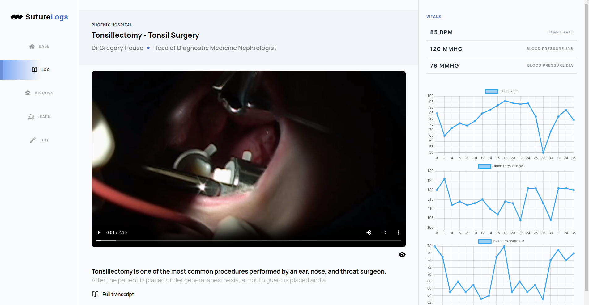Surgical Logs: Our platform provides a comprehensive record of all surgical procedures performed, including procedural videos, patient vitals that are synced with the video, AI-generated surgery transcripts, and patient details. These logs serve as a vital resource for monitoring and analyzing surgical outcomes and advancing the field of surgery.