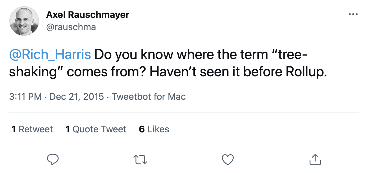 此外,当时 Rich Haris 也认为 Tree-shaking 可能不是一个很好的名称,考虑过用 Live Code Inclusion 这个短语来表示,但是似乎会造成更多的困惑......让我们看一下 Rich Haris 的原话: