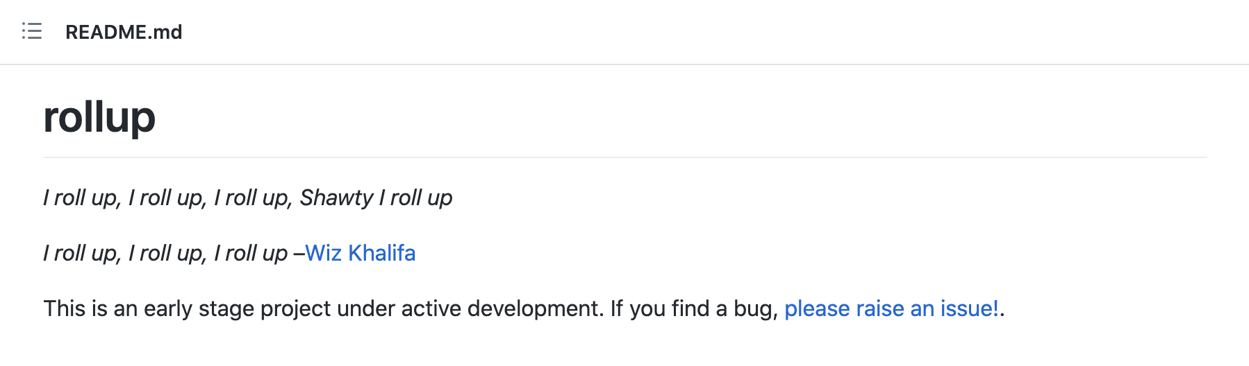 Rollup 的命名来源于一首名为《Roll up》的说唱歌曲,我想这应该出乎了很多同学的意料。不过话说 Evan You 也喜欢说唱,然后我(你)也喜欢说唱,所以这也许可以论证我(你)选择前端似乎没错?这里附上这首歌,你可以选择听这首歌来拉近 Rollup 的距离。