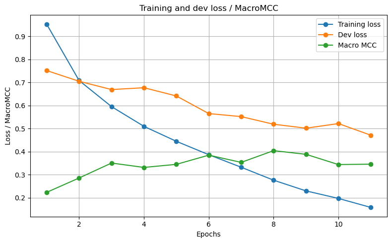 Training loss decreases consistently. Dev loss flattens around epoch 8, where Macro MCC peaks β confirming the value of early stopping for model selection.