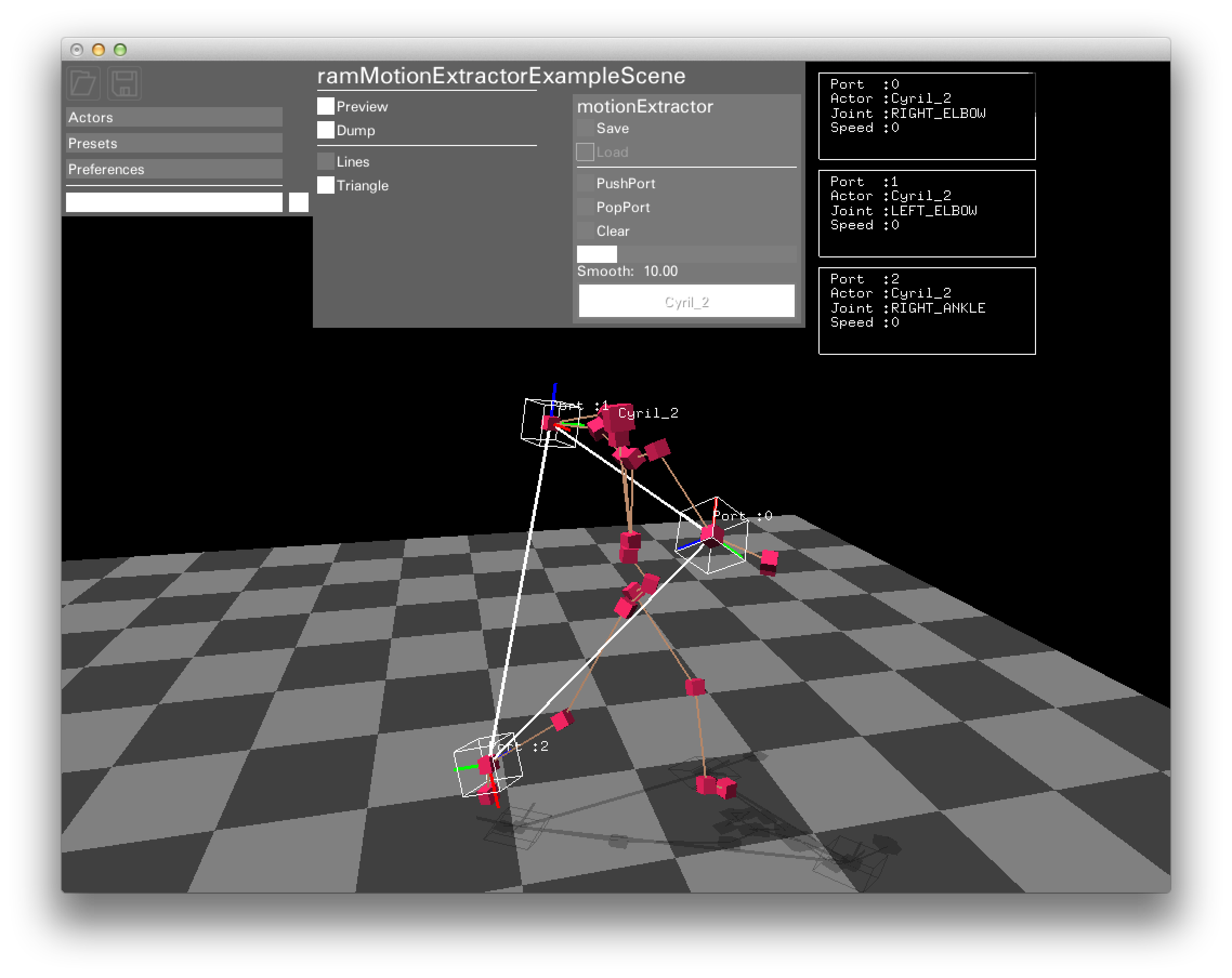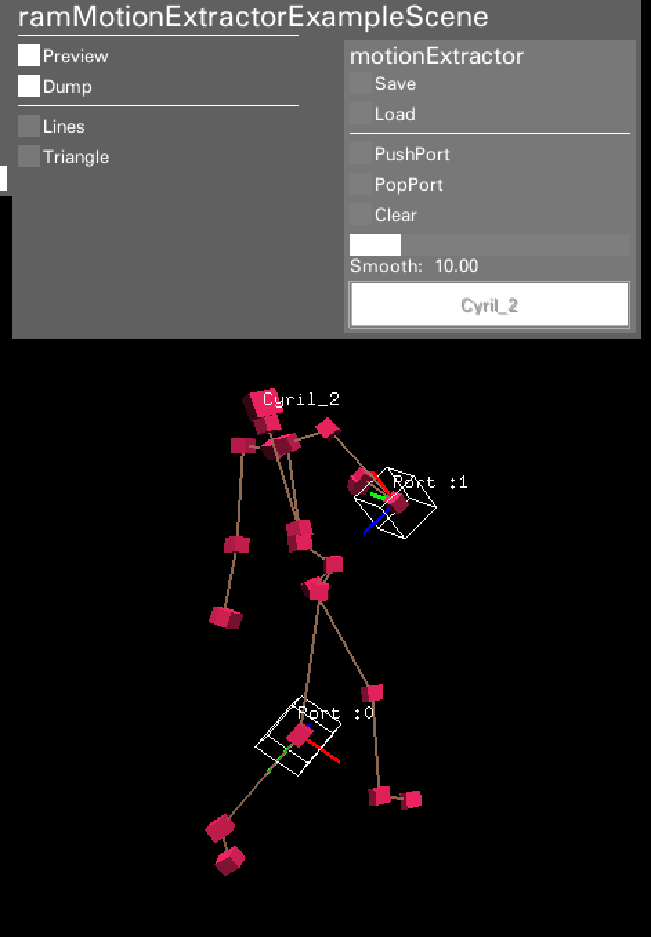 保存はSaveボタン、読み込みはLoadボタンで実行することができます。 デフォルトではmotionExt_シーン名.xmlという名前で保存されますが、プログラム内で**ramMotionExtractor::Save(string file)及びramMotionExtractor::Load(string file)**を実行する事で任意のファイル名で保存することができます。