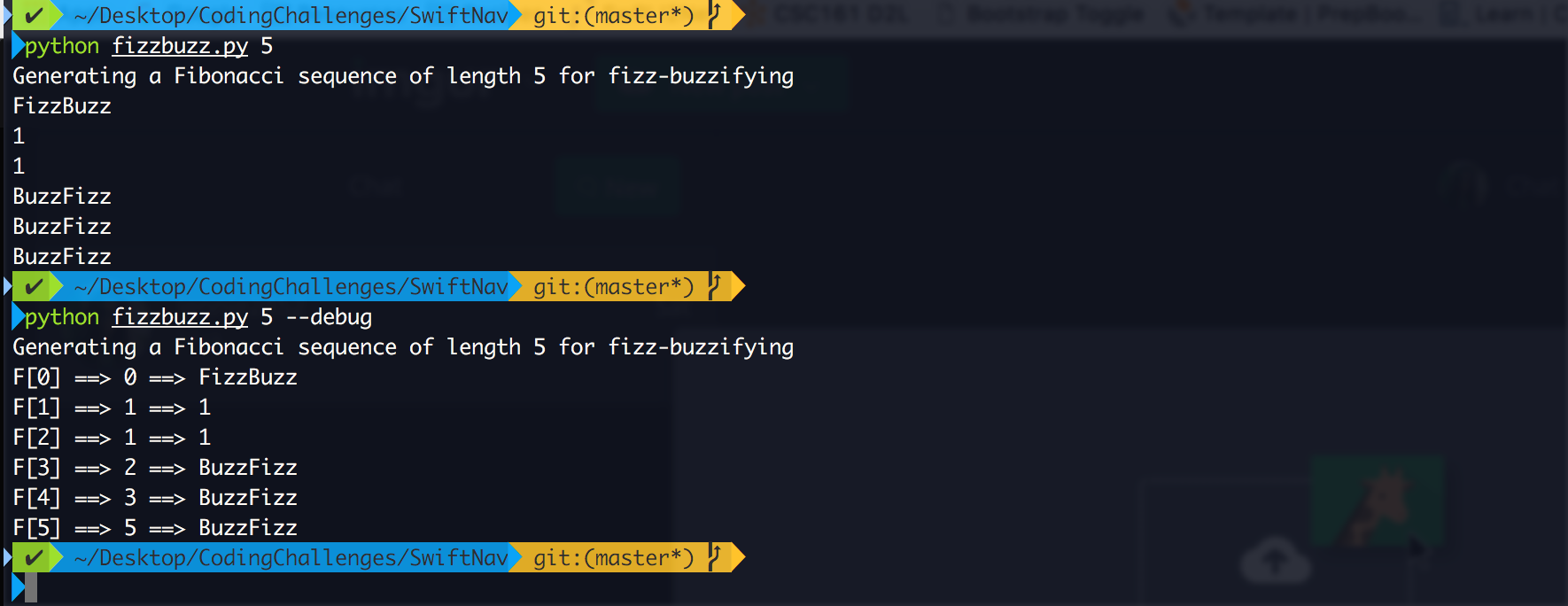 Simple! Just run from the command line with a Python 2/3 interpreter. Optional --debug argument will print out the Fibonacci sequence number, the actual fibonacci number, as well as the fizzbuzzed encoding.
