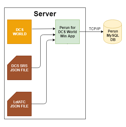 Provided windows app puts received TCP packets to MySQL database; additionaly Perun windows application can be used to merge LotATC and DCS SRS data in one database making Perun for DCS World wannabe ultimate integration tool for the server admins.