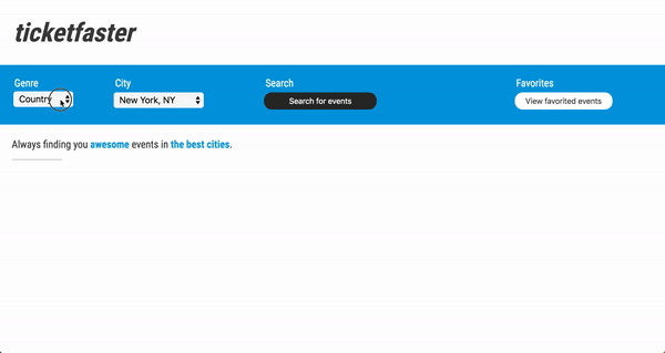 Ticketfaster is a search tool that retrieves the best events, specified by genre and city, and allows users to save them to their favorites and easily access ticket purchase pages.