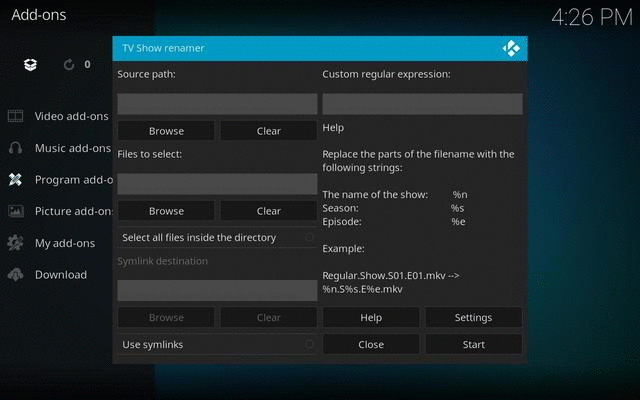 script.customregex A Kodi frontend for ghickman/tvrenamr Screen capture Instructions Build it with make Select the zip file in Kodi License tvrenamr - MIT License defusedxml - PSFL my code - GPLv3