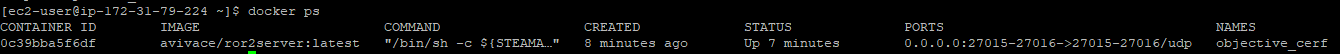 [ec2-user@ip-172-31-79-224 ~]$ docker run -p 27015:27015/udp -p 27016:27016/udp avivace/ror2server:latest
