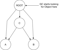 p cWhat prevents c from being garbage collected? Something must hold a reference to c so that the garbage collector can know that it shouldn't be GC'd. This is where ROOTS come in. Roots are special nodes in the system that hold on to these references: