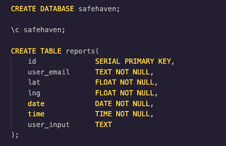 Safehaven uses Google Maps API so that users are able to seamlessly glide across the map and search for incidents of sexual assault across Australia. When a user wants to make a report, they navigate to "Report Incident" in the nav bar. Once the user has submitted their incident, we verify their email in our database (feature to come) and then publish the incident with a marker and info box on the map.