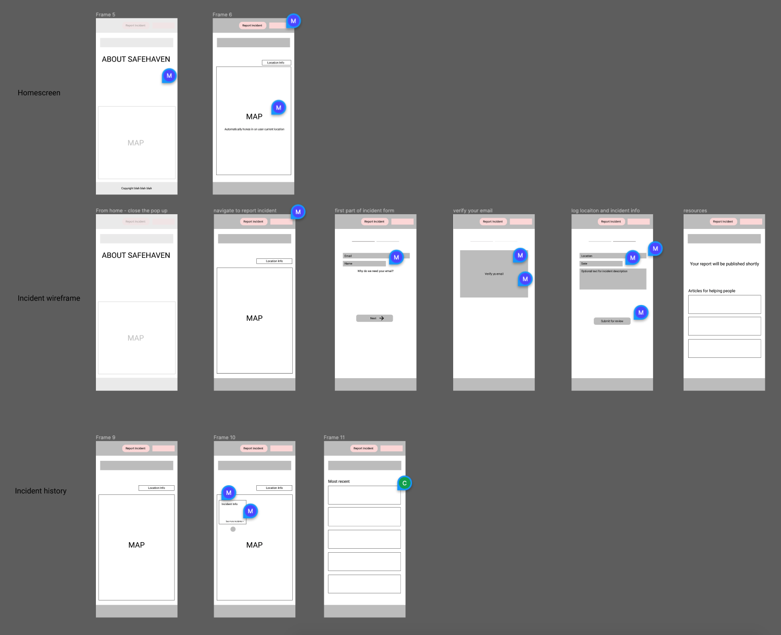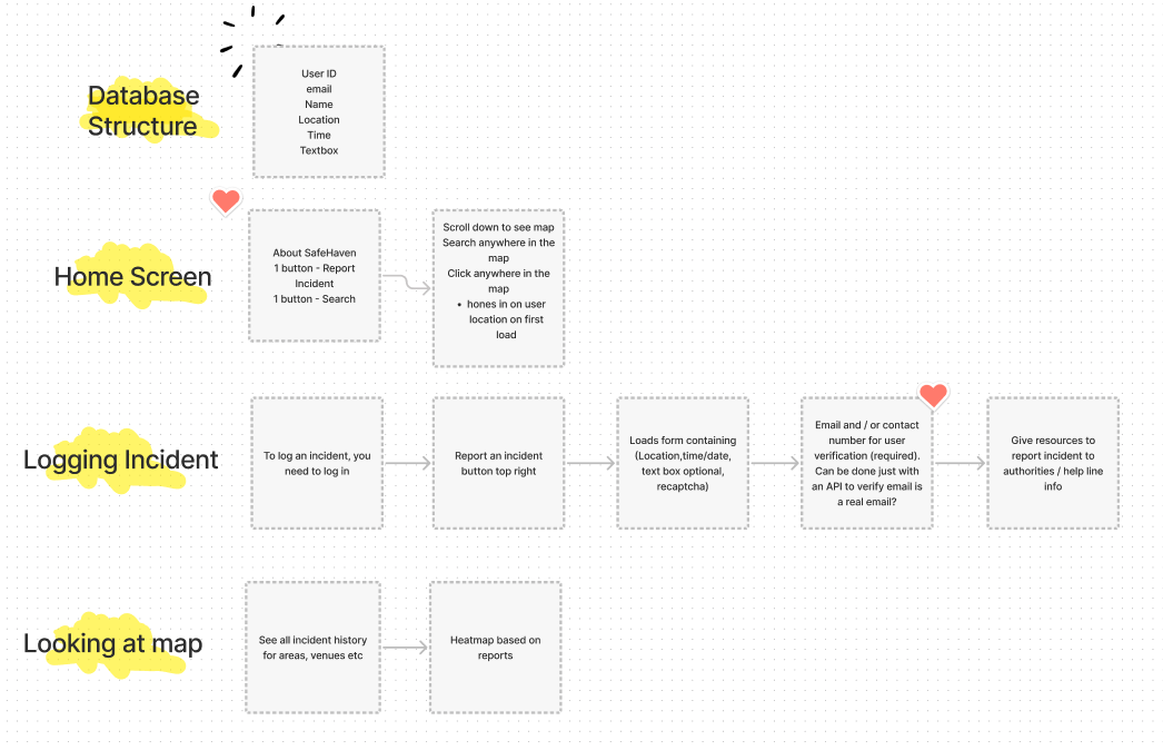 Safehaven is a mobile-first app created predominantly for women and LGBTQA+ folks to report incidents of sexual assault across Australia. The app allows users to view incidents reported by other anonymous users across cities, and to easily report incidents themself. This is an app that we would prefer to not need, but unfortunately do. Although the locations pinpointed on the map are not themselves 'safe havens', we hope that this app may help users feel and stay safer in their day-to-day lives.