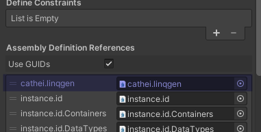 }The other thing that I am not sure which might be an issue is, all of my code is a package and contained within Assembly Definition files, and as such, in order to reference this package, I added this package as a local package and had to create an Assembly Definition file within your packages main folder. Then in my package, I had to add a reference to that newly created Assembly Definition in order to be able to gain access via using Cathei.LinqGen;