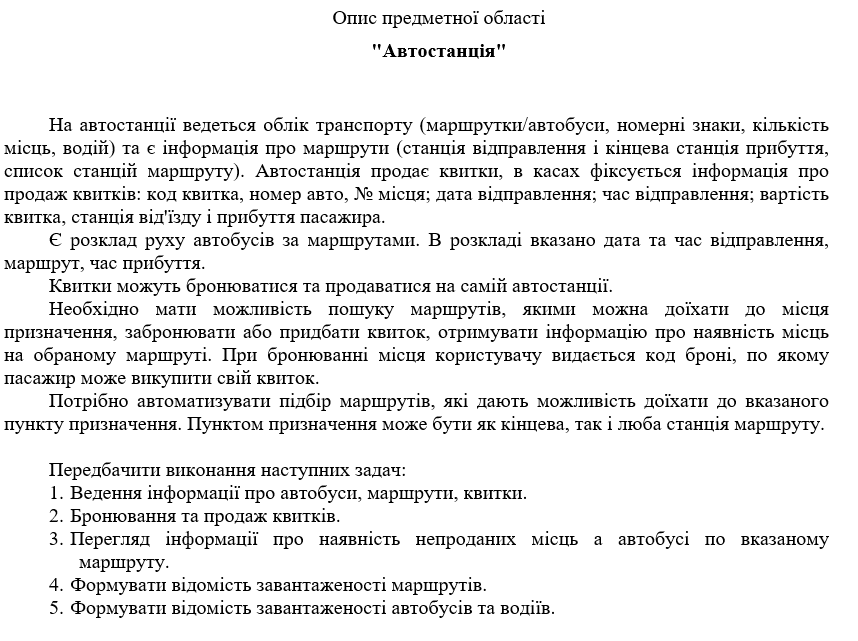 At the bus station, there is a record of the vehicles (buses/minibuses, license plates, number of seats, driver) and information about the routes (departure station and final destination station, list of stations along the route). The bus station sells tickets, and information about ticket sales is recorded in the cash registers: ticket code, vehicle number, seat number; departure date; departure time; ticket price, departure and arrival station of the passenger.