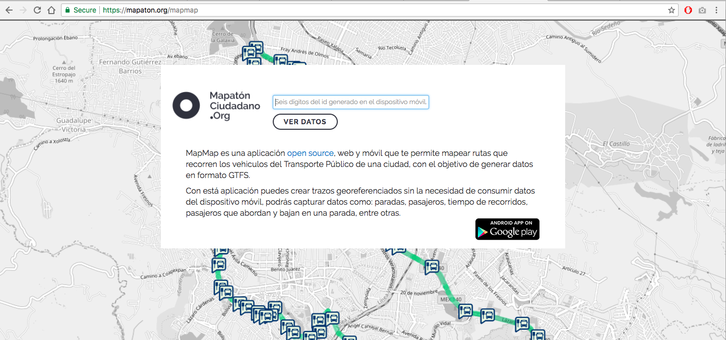 Éste ejercicio consistió en el uso de tecnologías de posicionamiento geográfico (GPS) a través del uso de MapMap para la recolección de datos que permitieron crear feeds de las rutas de transporte público liberando esta información en formato abierto (GTFS, JSON, GIS, Shapefiles y GeoJSON) permitiendo ser utilizados por sistemas de navegación y buscando que el uso de los datos liberados permitan mejorar la movilidad de una ciudad.