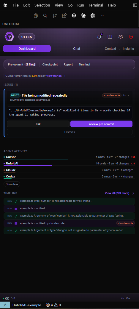 Drift detection catches agents stuck in loops. If Cursor runs npm install three times in a row with the same failure, UnfoldAI flags it as a drift pattern and lets you intervene before the fourth attempt makes things worse.