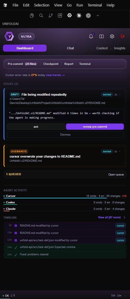UnfoldAI watches every agent action inside VS Code β commands, file changes, diagnostics, dependencies β and turns failures into issue cards with full context, AI fix plans, and recovery points. Before a bad agent run becomes a lost afternoon.