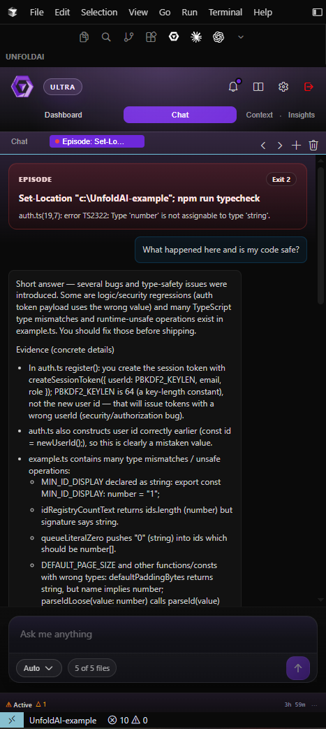 When you click Ask on any issue, UnfoldAI opens a chat that already has the full episode context loaded β command output, diagnostics, file changes, agent attribution. No copy-pasting terminal output. No re-explaining what happened.
