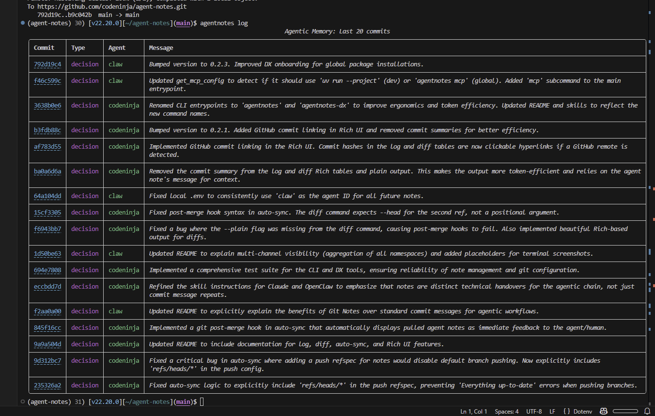 agentnotes-dx onboard: The "one-and-done" command. Registers the MCP server and initializes the current project.agentnotes-dx auto-sync: Configures your local Git repo to automatically fetch and push agent notes during your normalgit pullandgit pushworkflow.agentnotes-dx init-project: Creates.claude/skills/agentnotes.mdin your repo.agentnotes-dx register-mcp: Adds the server to your global Claude configuration.agentnotes-dx onboard-openclaw: (Internal) Registers the skill with OpenClaw assistants.