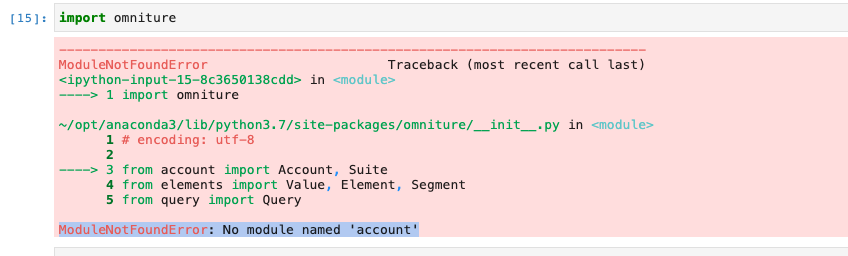 I am not able to import the Omniture package. I am able to install it but It gives me error while import. Some information: Python : 3.7.7 OS : Mac os