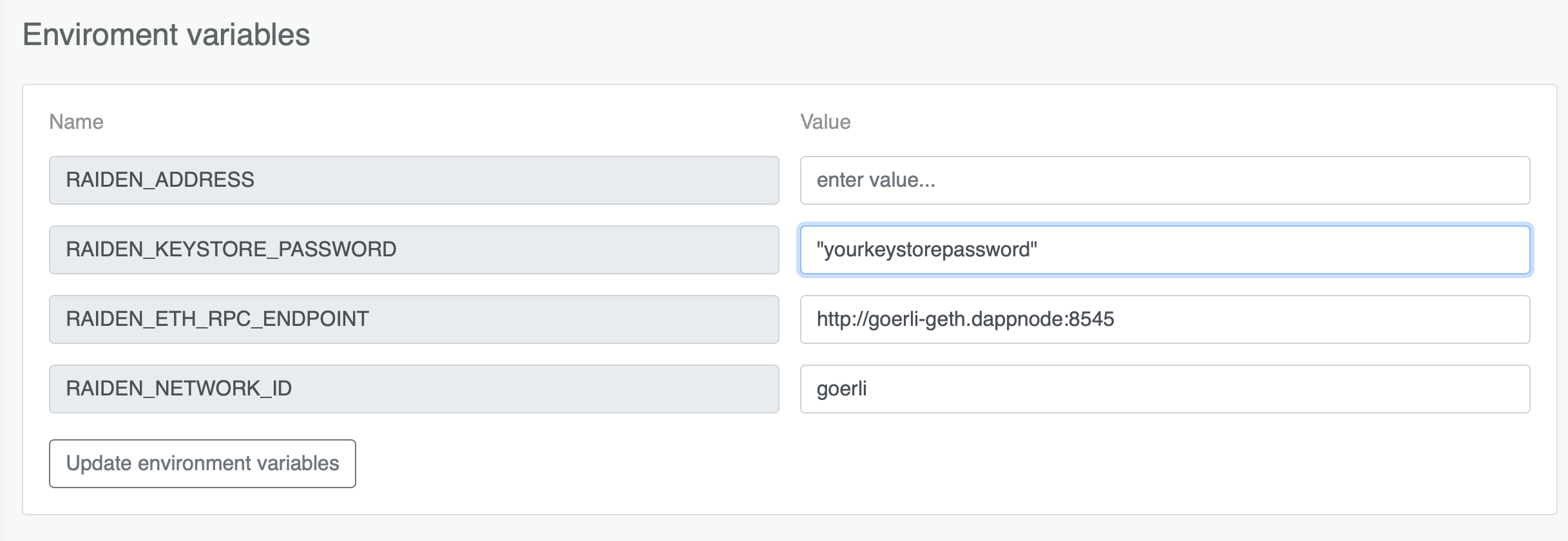If you have different keystores with WETH and you want to switch the account, you can do so by uploading your keystore file to the Raiden DAppNode Package (DNP) and by writing the address and password of your keystore in the environment variables field.