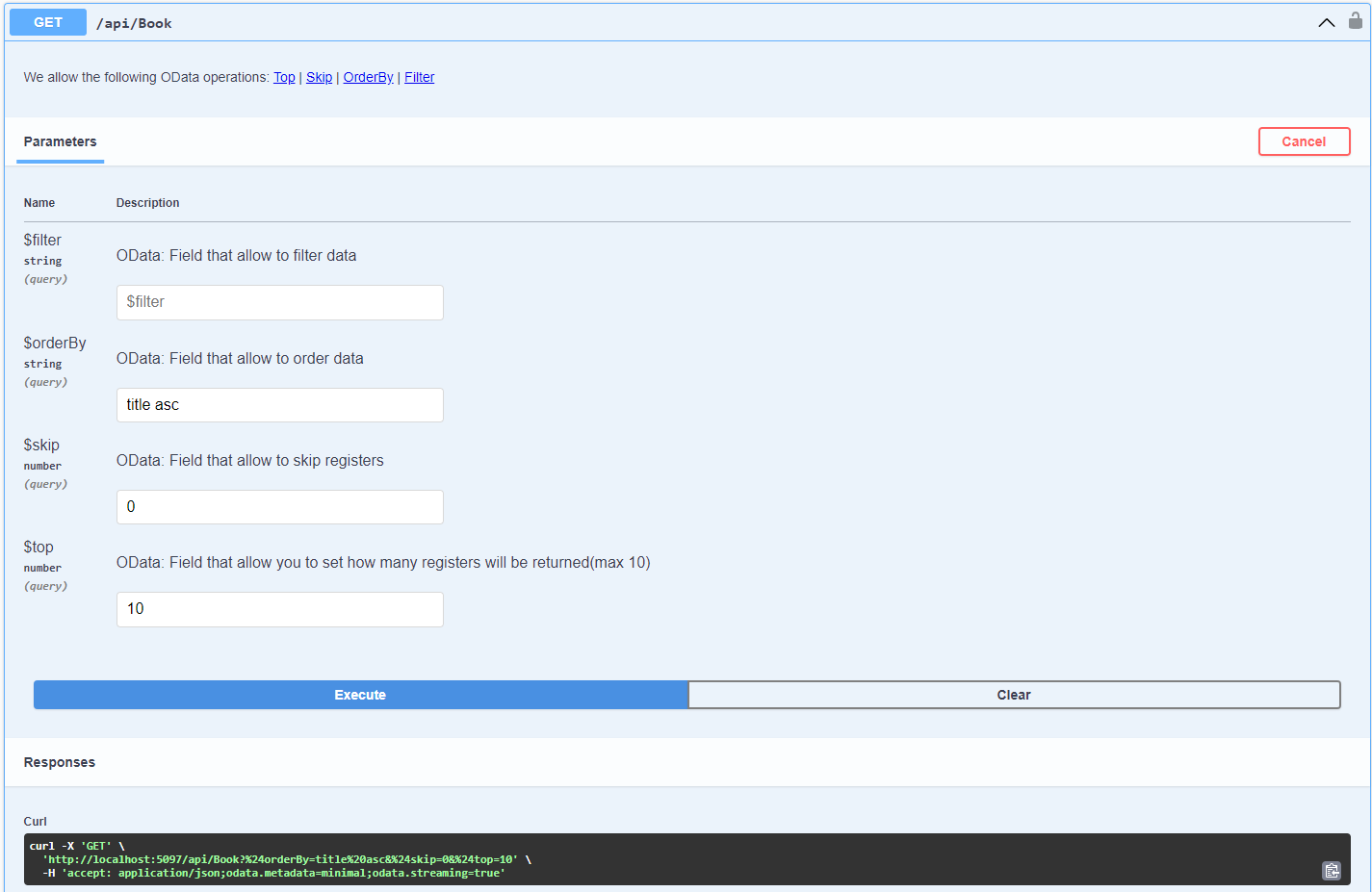 If you use Swagger UI and wants to get all data books, needs to specify odata parameters or clean all of them.