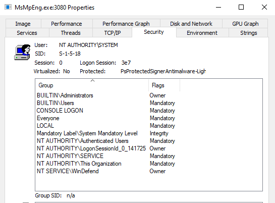 I did duplicate MsMpgEng's token and play around with what I could do with it. By doing so you become part of the WinDefend Service group, which is assigned Full permissions/ownership of MsMpEng.exe and the WinDefend service. While this allows you to open up WinDefend in the services panel and seemingly change settings (actions on failure, user the service runs as, etc), you receive an access denied message upon trying to apply any of those changes. Similarly you are still prohibited from stopping the service, killing MsMpEng.exe via taskkill, etc.