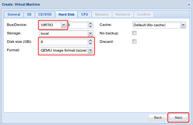 Im Reiter 'Hard Disk' als 'Bus' 'VirtIO' einstellen, die Festplattengröße auf 6GB begrenzen und als Format 'qcow2' wählen.