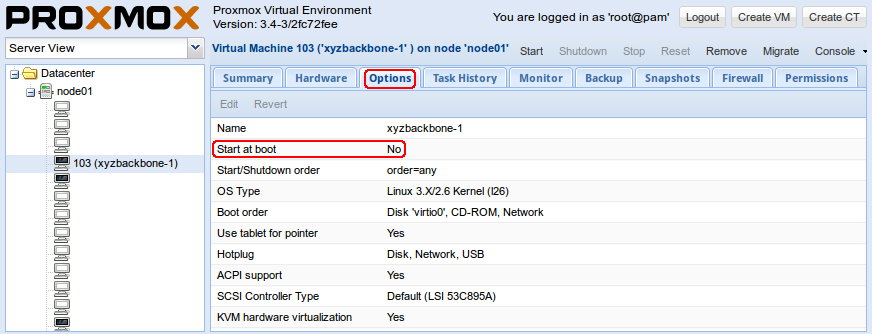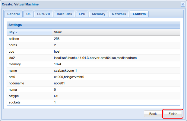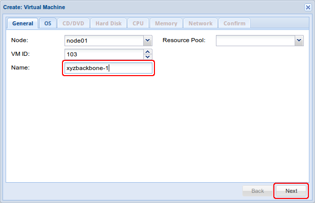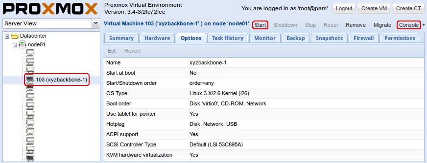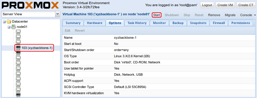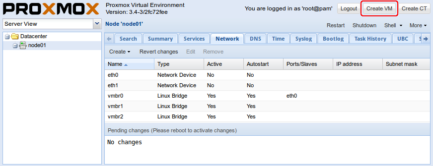 Der Supernode wird im Proxmox Webinterface angelegt indem man auf der linken Seite den Server auswählt und dann oben rechts auf 'Create VM' klickt.