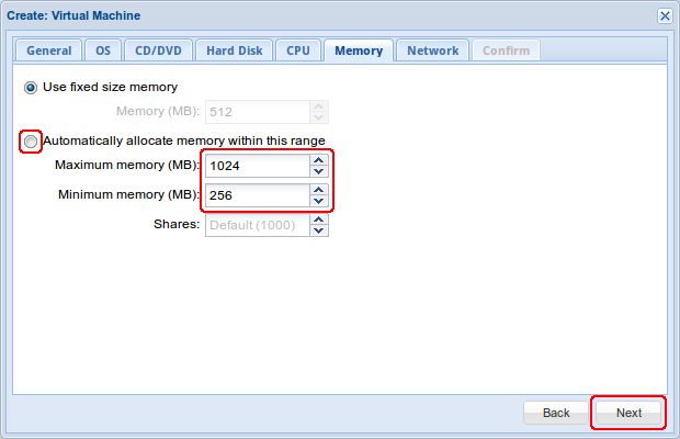 Im Reiter 'Memory' unter 'Automatically allocate memory within this range' 256-2048MB festlegen.
