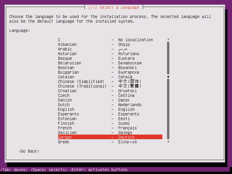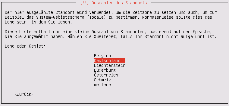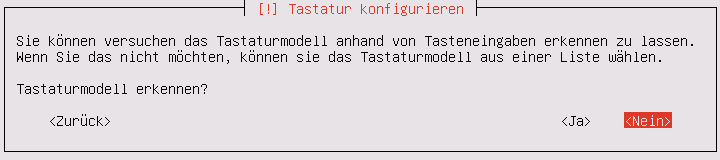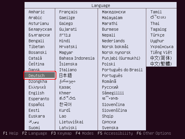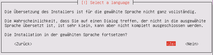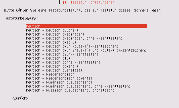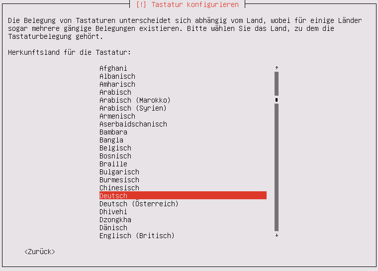 Als Installationssprache jetzt nochmal Deutsch auswählen, die auswahl trotz unvollständiger Unterstützung bestätigen und als nächstes das Tastaturlayout auswählen.