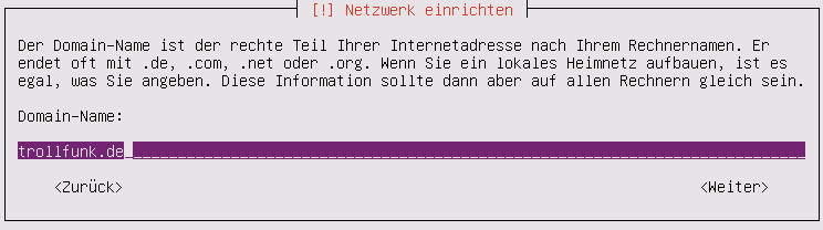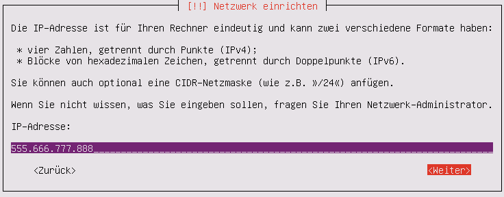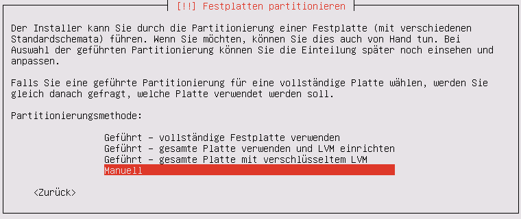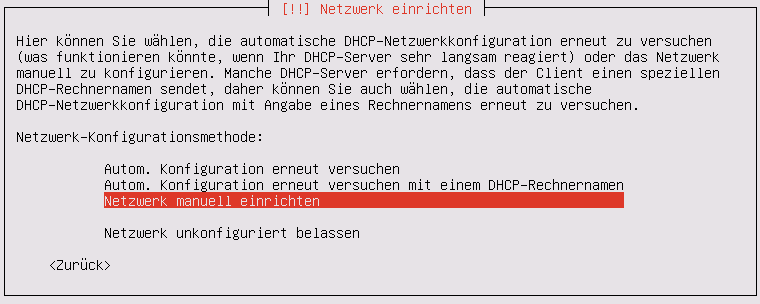 Sobald der Server versucht das Netzwerk automatisch zu konfigurieren, dies abbrechen und die manuelle Netzwerkkonfiguration auswählen.