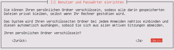 Da auf dem Server keine Persönlichen Dateien gespeichert werden sollen ist es nicht notwendig den persönlichen Ordner zu verschlüsseln.