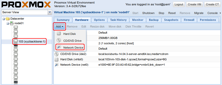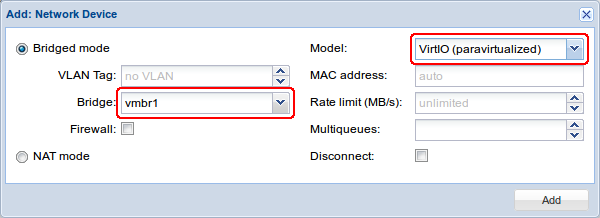 Nun muss im Proxmox für die VM eine eth1 hinzugefügt werden, die auf der vmbr1 hängt und Virtio verwendet.