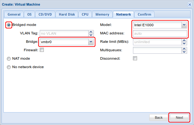 Im Reiter 'Network' als Netzwerkkarte 'VirtIO' auswählen und die MAC Adresse der für diese VM zu verwendenden öffentlichen IPv4 Adresse eintragen. Bridged Mode übernehmen wir so und vmbr0 auch diese.