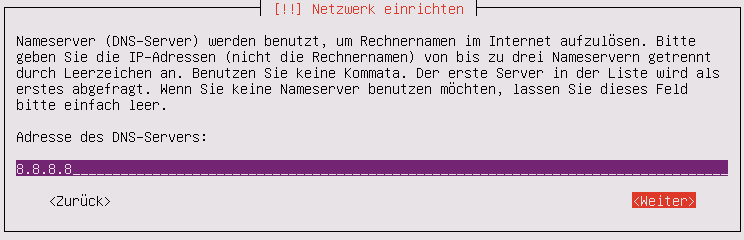 Als DNS geht z.B. der 8.8.8.8 von google.
