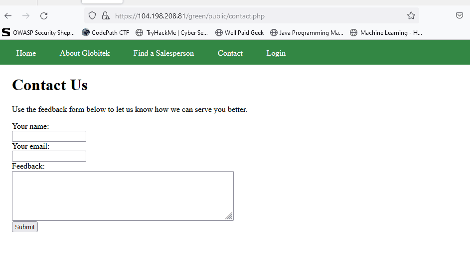 Description: The sites Contact Us site has a form for user feedback that can be exploited using a alert script in the comments.