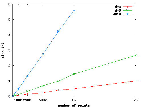 The chart shows the time in seconds (y-axis) needed for the computation of the miniball of n random points (x-axis) in dimensions d (3, 5, or 10 in this chart).