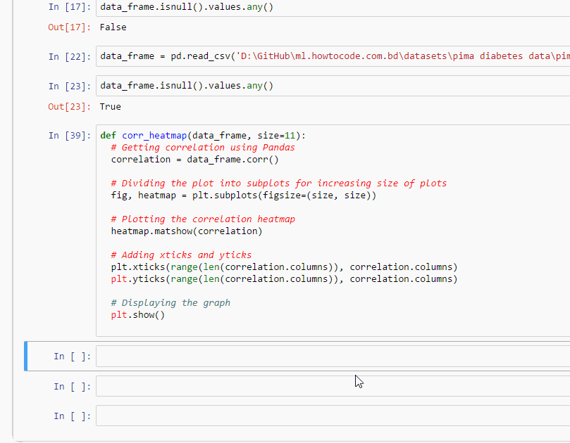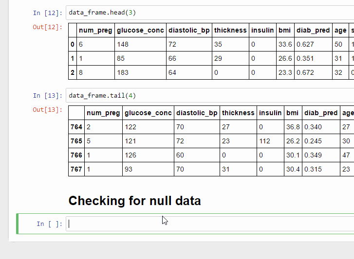 এখানে আমি pima-data.csv ফাইলের একটা সেল ইচ্ছে করে ডিলেট করে আবার Pandas দিয়ে লোড করে কোডটা চালিয়ে দেখলাম।