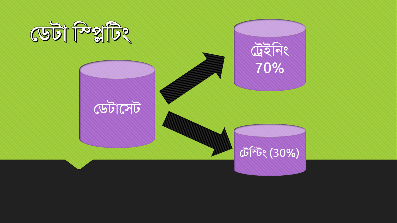 ট্রেইনিংয়ের শুরুতেই যেটা করতে হবে সেটা হল ডেটাসেট ভাগ করে নিতে হবে। গড়পড়তায় আমরা সাধারণত 70% ডেটা রাখি ট্রেইনিংয়ের জন্য এবং বাকি 30% রাখি টেস্টিংয়ের জন্য।