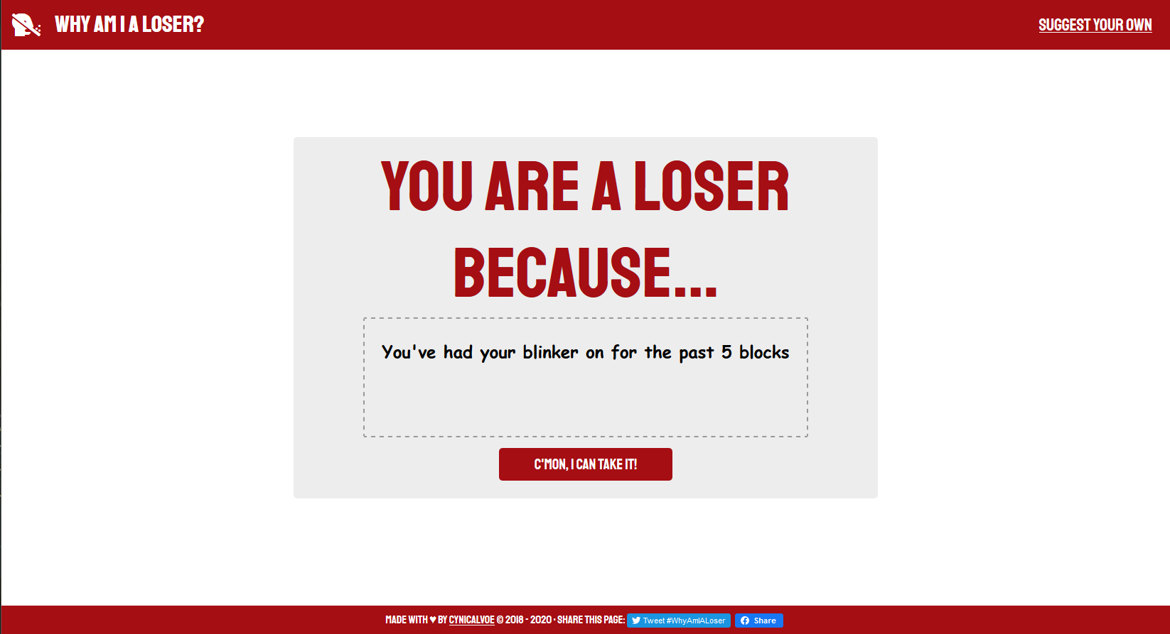 WhyAmIALoser is a lightweight, responsive, Single-Page Application written in Angular. "Reasons" are stored in a JSON file that is loaded when the user first visits the page, and are chosen randomly. Currently, new reason submissions are accepted via a Google Forms link at the top of the page.