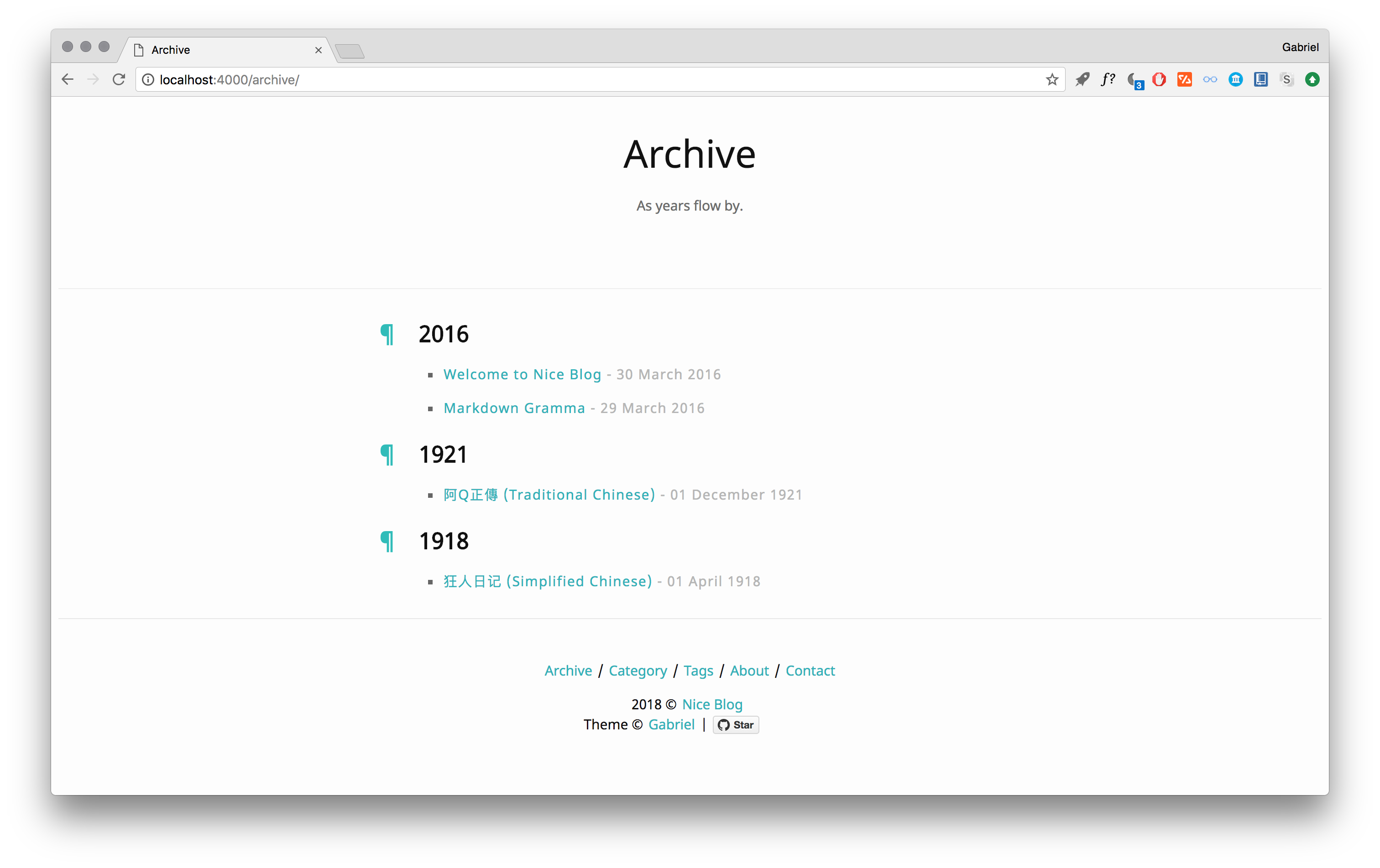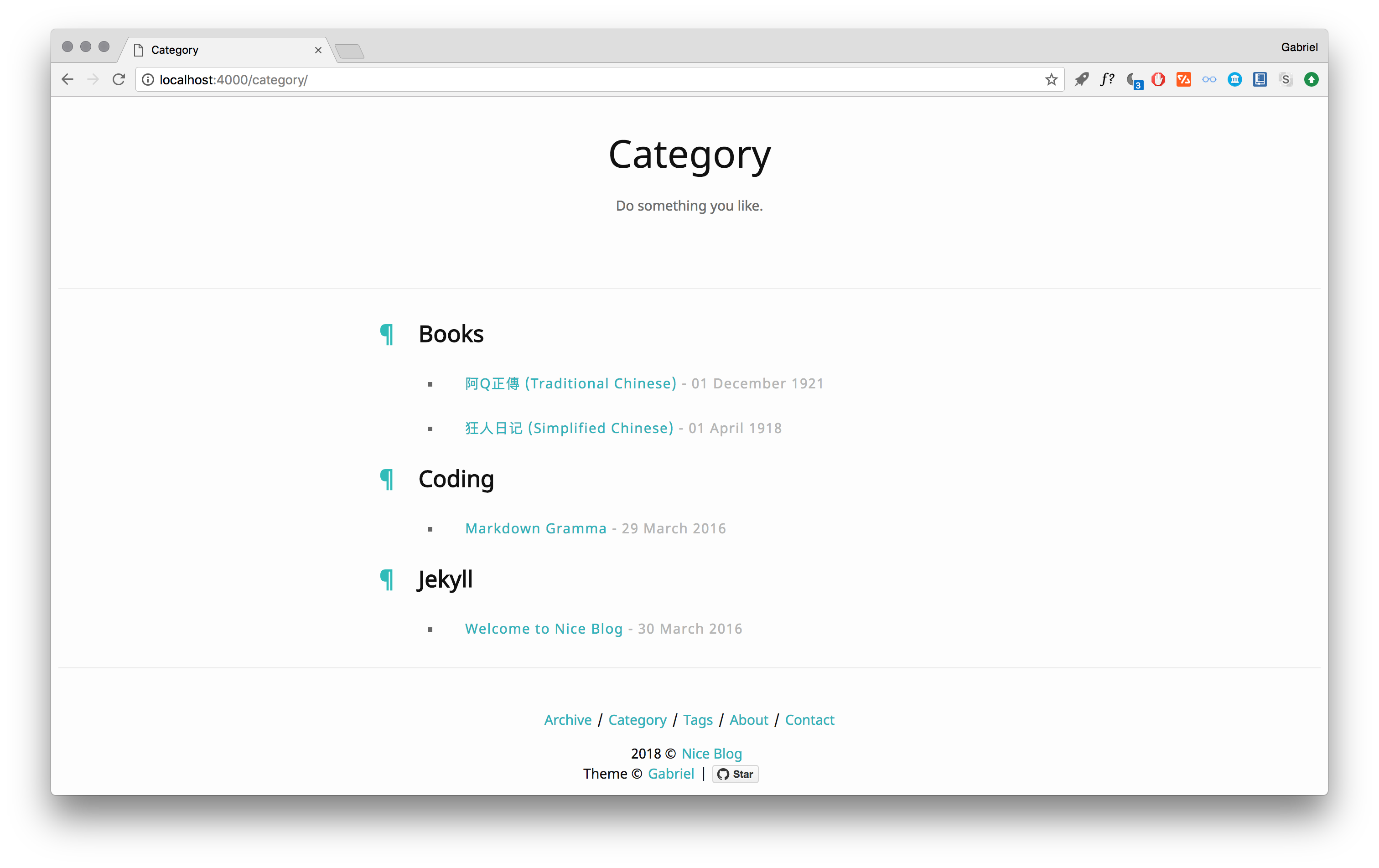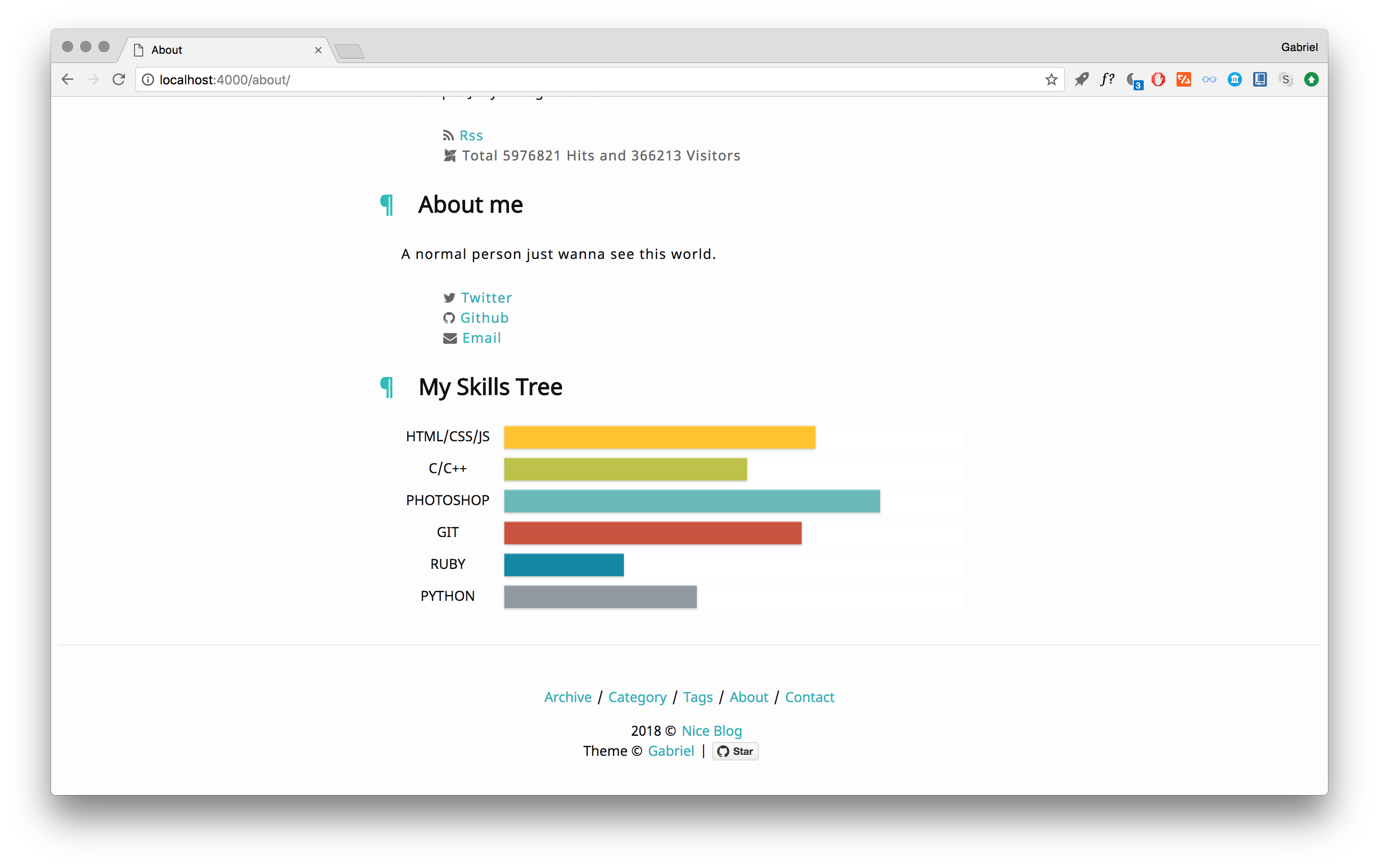 $ git clone https://github.com/gabriel-chen/Nice_Blog.gitChange the settings in _config.yml file and then you can use this theme.