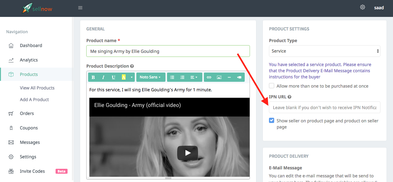 - Afterward, you must add a product and ensure you add the the url you wish to receive IPN notifications as show here