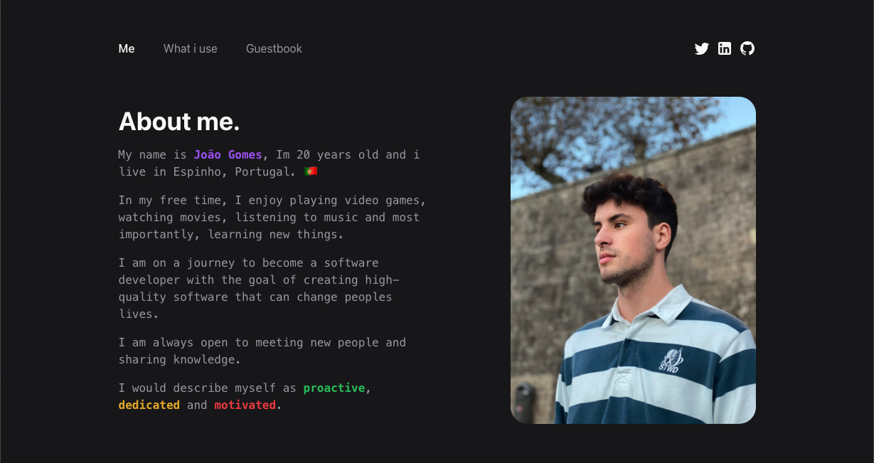 joaogomes.dev About | Technologies | Licence | Author 🎯 About My own piece of the internet. 🚀 Technologies The following tools/dependencies were used in this project: SvelteKit Tailwind CSS Prisma Supabase TypeScript 📝 Licence This project is under license from MIT. For more details, see the LICENSE file. Made with ❤️ by João Gomes Back to top