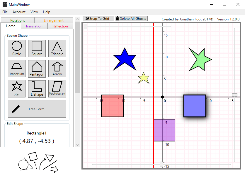 Transformations is a free teaching and testing tool for transformations in mathematics; this includes translations, reflections, enlargements, and rotations. The program was originally developed for a local school as part of my A-level computer science project. I have now decided to make the project publicly available for free to any other school which could benefit from it.