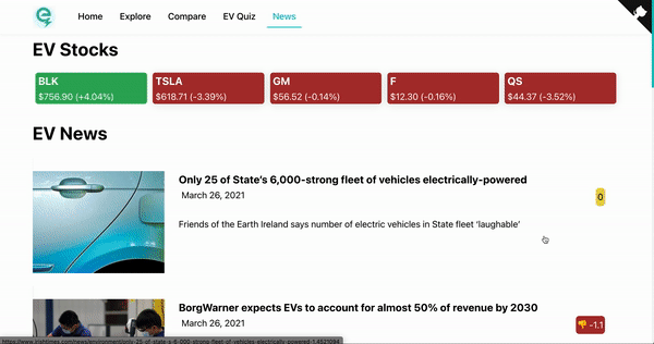 The news page has stock information of various companies at the top, where a ticker is red when the company's stock price is down on the day, and green when the company's stock is up on the day. Below the stock section, news articles pertaining to electric vehicles are shown, where the image, title, date, description, and sentiment score are displayed for each article. The sentiment score is determined by feeding the contents of the article into the Google Cloud natural language processing service. The stock and news information is updated live, and retrieved using API's provided by GNews and AlphaVantage.