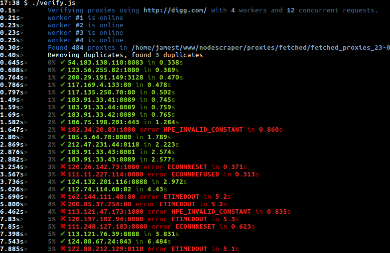 verify.js takes a list of HTTP proxies and will attempt to establish a connection to a target site using each proxy. The proxies that successfully connect and enable you to hide your own IP will be saved.