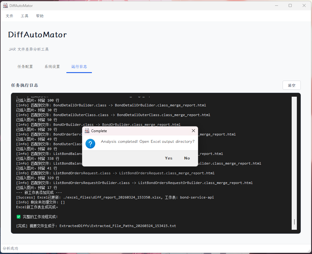 一个功能全面的 JAR 文件差异分析自动化工具,通过 WinMerge 比较两个 JAR 文件,解析差异报告,提取差异文件,反编译 .class 文件为可读的源代码,并生成批量比较任务和 Excel 报告,形成完整的 JAR 文件差异分析工作流程。