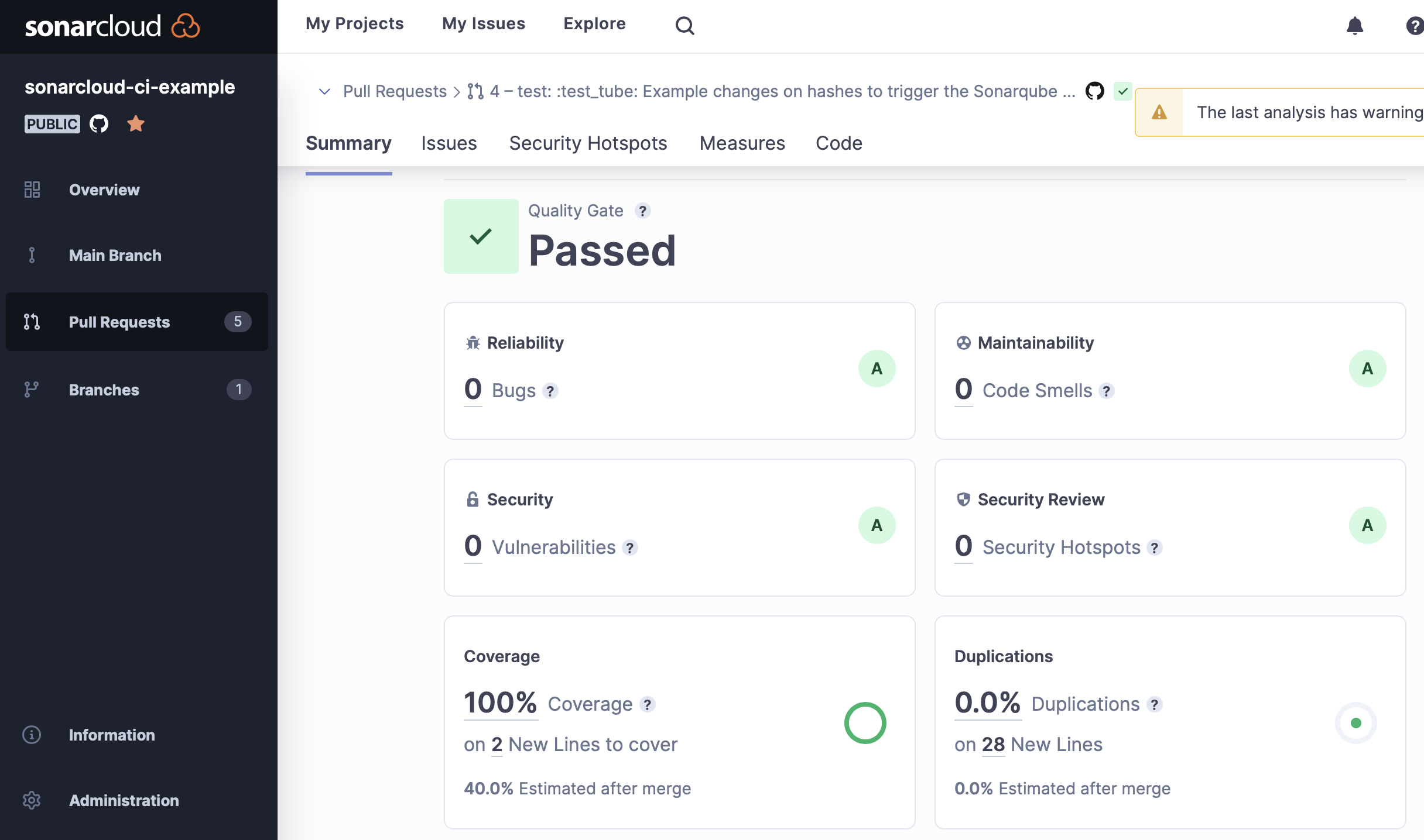 In this section we will exemplify the whole process (Creating a PR & checking the analysis result) with images