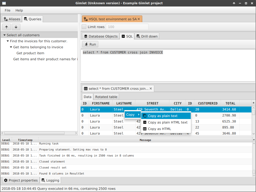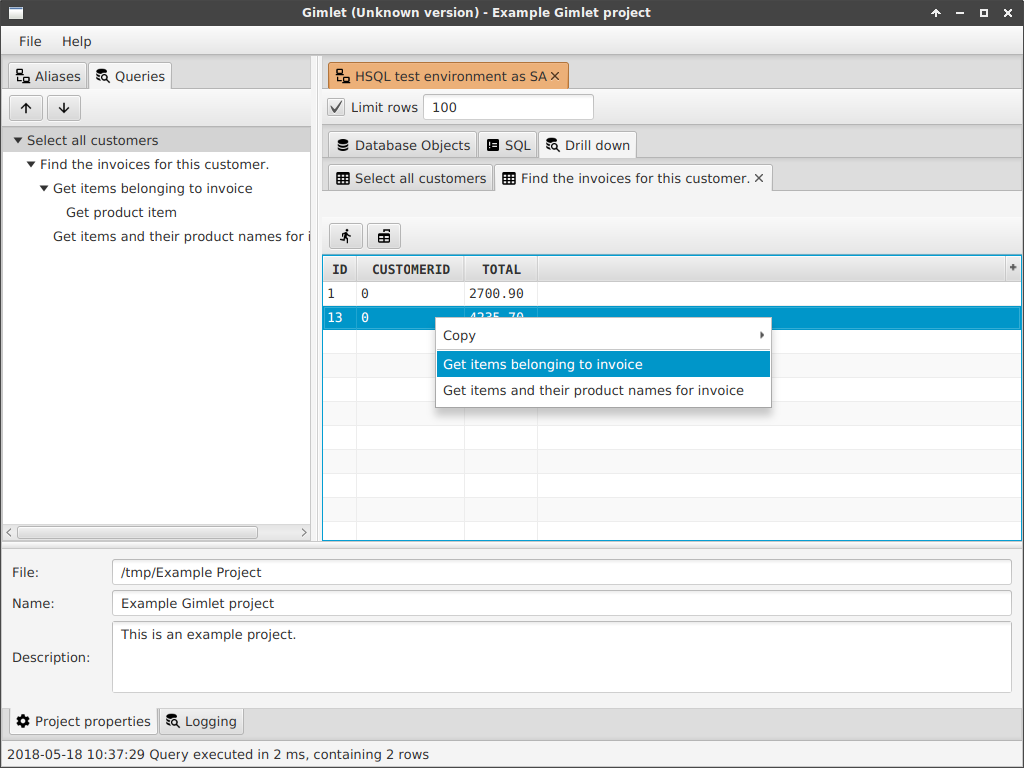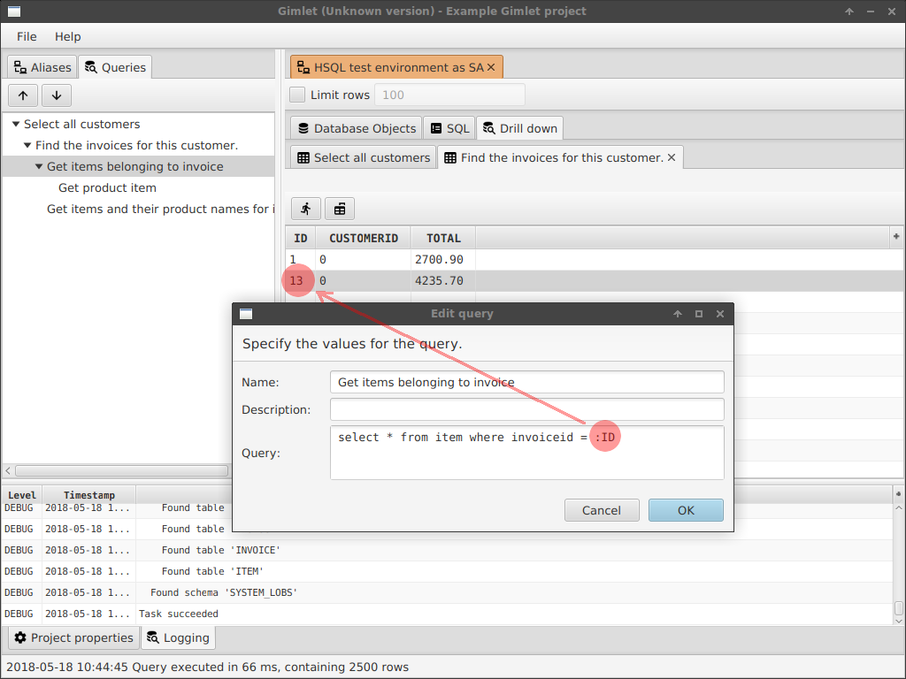 select * from item where invoiceid = 13Joins are useful of course, but fail to display data properly when you have to find specific information when there is more than 1 join. You could get double data and things. Also, when there are N:M relations between tables, a drill-down functionality might come in handy. This tool attempts to make that drill down configurable.