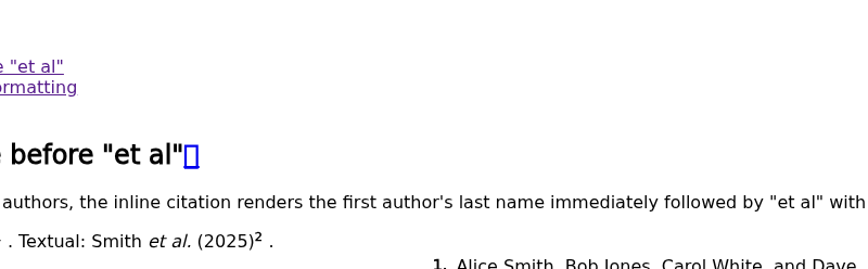 When a reference has more than 3 authors, the inline citation rendered the first author's last name immediately followed by "et al" with no space and no trailing period. Before: `(Smith<em>et al</em>, 2025)` After: `(Smith <em>et al.</em>, 2025)` Fixes leanprover#780