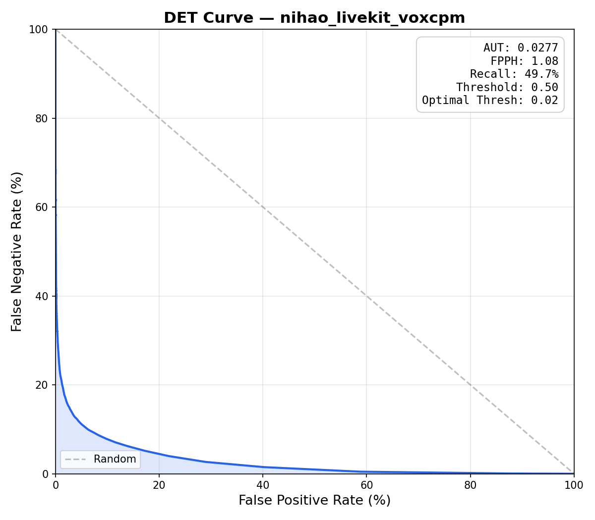 livekit-wakeword eval configs/prod.yaml # Evaluate model (DET curve, AUT, FPPH)You can also evaluate any compatible ONNX model (e.g., one trained with openWakeWord):
