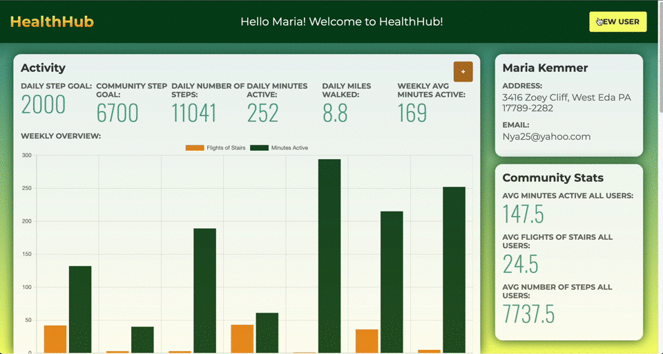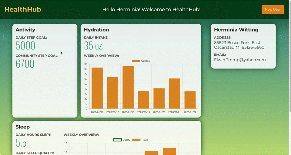HealthHub is a health and wellness application. Upon page load, the site displays a user’s information (name, address, and email), hydration data, and sleep data. It compares their daily step goal to an average amongst a database of users. The site also greets the user by their first name at the top of the web page. This application was created using Webpack, which is a modular bundler used to group HTML, CSS, and JavaScript files into more efficient files for a browser to read. It also accounts for npm packages, which our application includes many of.